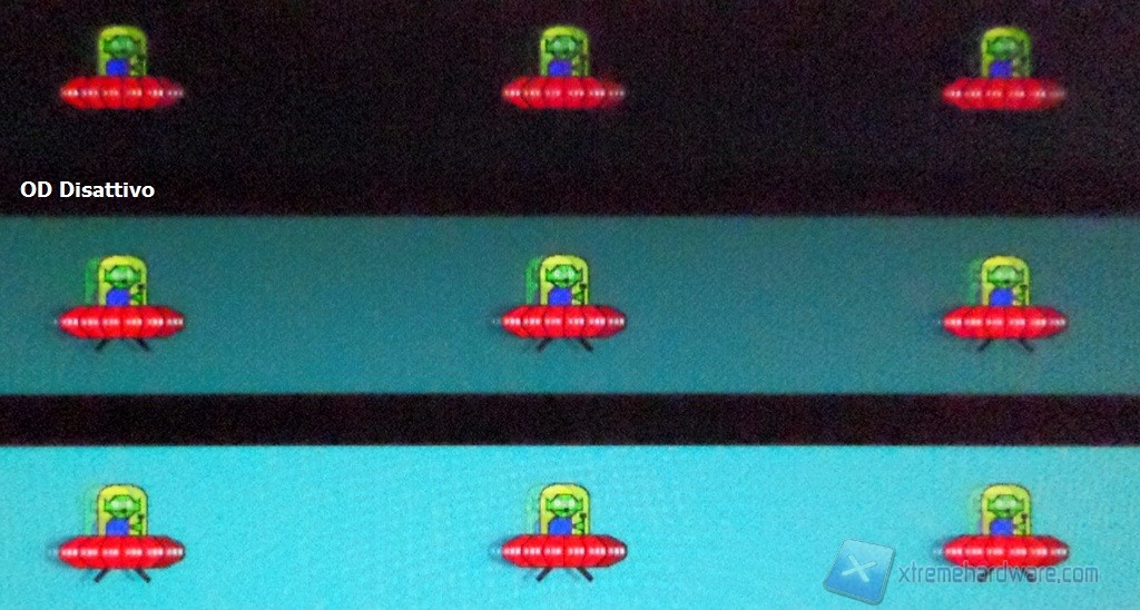 Partiamo da un presupposto: l'ASUS PG278Q non è mai lento. Con l'overdrive disattivato è comunque piuttosto veloce e la media dei risultati è soddisfacente, anche se il risultato peggiore potrebbe far pensare diversamente. L'impostazione Extreme mostra invece il reverse ghost in più di qualche occasione, manifestando un setting spinto. La via di mezzo, Normale, risulta l'opzione consigliata, dato che l'effetto ghost non è marcato e il reverse ghost è davvero molto raro. Il vero vincitore in questo test è però l'Ultra Low Motion Blur che restituisce un'immagine quasi sempre priva di effetto ghost; i dieci risultati sono stati praticamente tutti uguali, senza considerare il fatto che in più di qualche occasione abbiamo fotografato il frame completamente nero. Nel test dell'ufo, la differenza con gli altri setting è netta, soprattutto per la definizione dell'oggetto in movimento più che nell'effetto scia, ma è riscontrabile più che altro di persona.